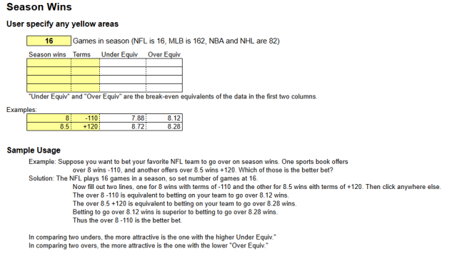 This Excel spreadsheet provides several tools useful in analyzing proposition bets. Discussions relative to its use appear in the books Sharp Sports Betting and Weighing the Odds in Sports Betting.
