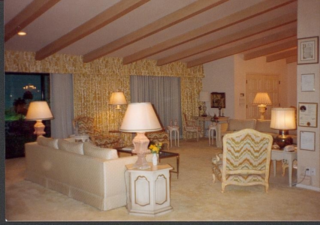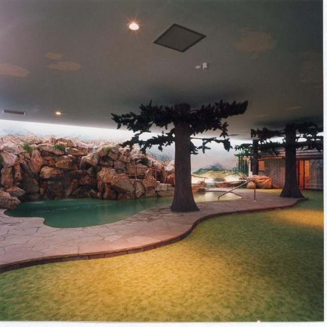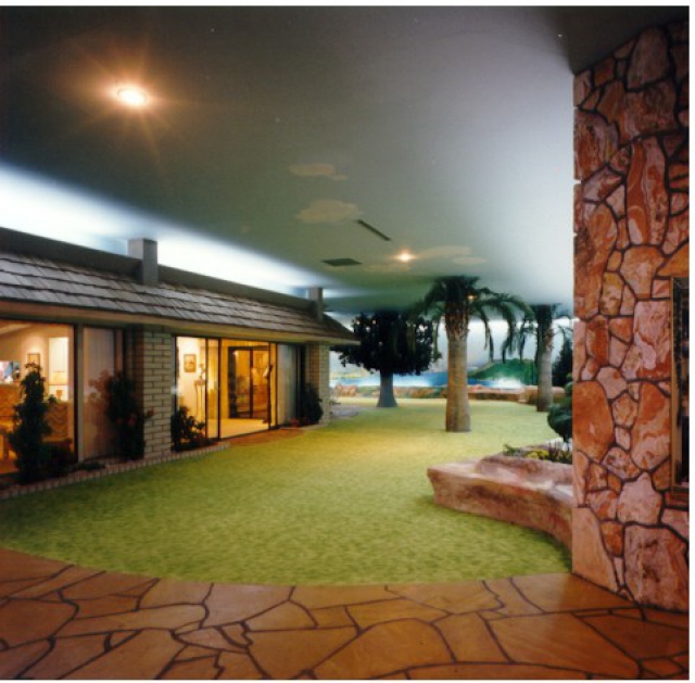 Today, if you step out of the elevator and into the house, it's like entering an opulent time capsule. The expansive living room is decked out with antiques, '60s collectibles, and yellow shag carpet, while the pink bathroom features original '70s Avon cosmetics and a necklace that once belonged to Elizabeth Taylor. There's a heated swimming pool, sauna, and spa complete with a 15-foot waterfall, two hot tubs, a putting green, and a barbecue that's vented through one of a number of artificial trees. The property features original '70s state-of-the-art technology throughout, including computerized lighting that simulates different times of day and illuminates the panoramic murals that grace the surrounding walls outside the windows, to give the impression of real views. And it's all built to withstand nuclear explosions and radioactive fallout.