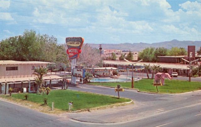 If it was a motel back then, Stoldal theorizes, it must have been very small indeed never to have issued postcards, which he considers unlikely, seeing as postcards were quite cheap to produce back then. However, he did locate a postcard, circa1957, advertising the Diamond Inn Motel in its previous incarnation as the Desert Isle Motel. It describes the Desert Isle as "50 ultra-modern units, some kitchens and suites, cooled by refrigeration, heated swimming pool and separate kiddy pool and baby pool, baby sitters, TVs, weddings arranged, show reservations, and sensible room rates," according to Stoldal, who wryly adds, "Sounds like the place to stay."