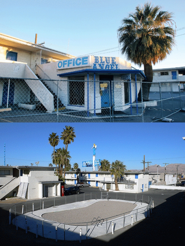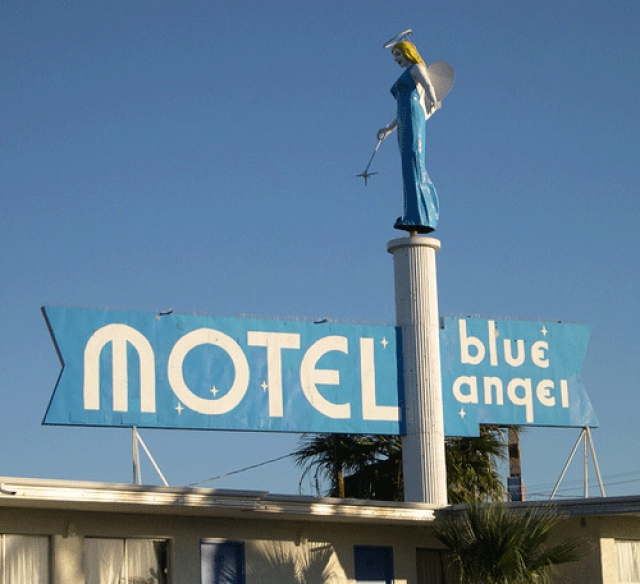 Beloved of tourists, as today's questioner bears witness, not to mention Las Vegas old-timers and anyone who, like My Week at the Blue Angel author Matt O'Brien, ever stayed or even resided at this slice of Las Vegas history, the Blue Angel is almost to downtown what the original "Welcome to Fabulous Las Vegas" sign is to the Strip (it's no coincidence, evidently, that the two were both the work of legendary local designer Betty Willis), so her departure or destruction would undoubtedly be mourned by many.