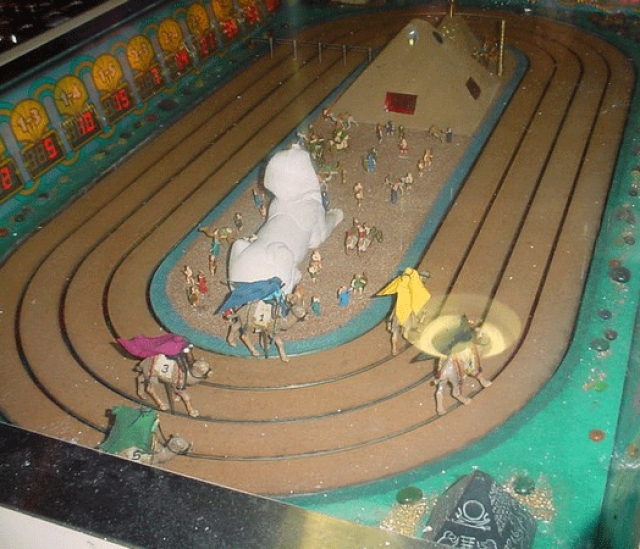 This "freshening up" spelled the end of the road for musty old Elias and Jody (we still prefer "Humpy and Lumpy"), who most likely ended up in a landfill somewhere, we regret to inform you, while the company who had employed camel-voice creator Michael Hooker (Creative Presentations) has since gone out of business. As a side note, the de-theming and modernization of the Luxor also saw the demise of the special Sigma Derby game in the casino, which featured racing camels, as opposed to horses (see below).