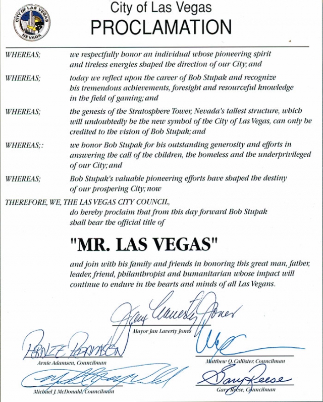 Funny you should ask, as we were also taken aback when we discovered this fact while researching the concluding installment of that epic two-parter we ran back in February, concerning the relationships between some iconic Las Vegas casino operators. It would very much appear, however, that there has only ever been one official "Mr Las Vegas," and that those honors belong to the one and only Bob Stupak, who was presented with a certificate to prove it, although at least two others claim that title, or have attempted to.