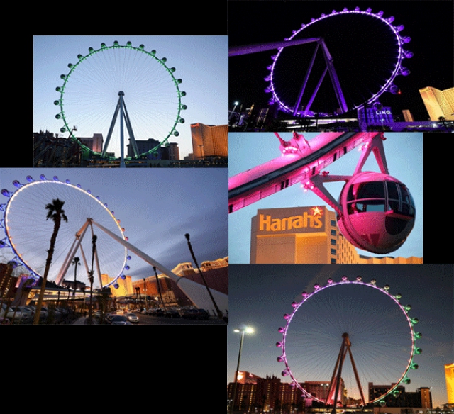 "We can also take full manual control of the color selection but how they 'play' around the wheel is all handled by the lighting computers," says Caesars spokeswoman Stella Moon. The colors can even "race" around the perimeter of the wheel.