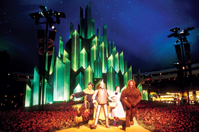 Once inside, visitors found themselves in the Oz Casino, facing Emerald City. Dorothy, the Scarecrow, the Tin Man, the Cowardly Lion, and the Wicked Witch of the West were all present, in audio-animatronic form, as was an elaborate yellow-brick-road walk-through, complete with cornfield, apple orchard, and a haunted forest. The road led guests to the door of the city and, once inside, to a performance of The Wizard's Secrets show. This all lasted until 1996 only, however, when the Oz Casino was axed and The Emerald City completely demolished (aside from a gift store, which was relocated and remained open until early 2003).