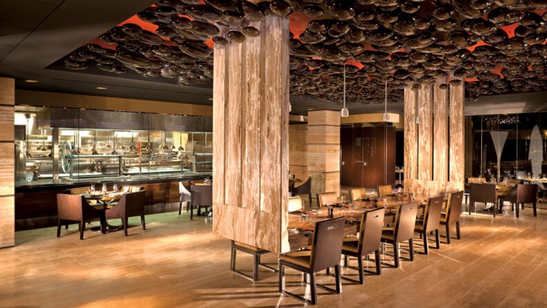 M Resort is beautiful and so is the APS&S room, with big picture windows overlooking the pool and providing a view of Las Vegas (M is elevated). Seating is out in the open, but it’s still a good date atmosphere. Service was excellent. We asked for rare lamb and the server requested it from the kitchen and brought a rack out to the table.