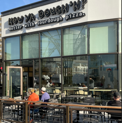 The only eatery at BLVD so far is How Ya Dough’n Pizzeria, also the only open business on the third floor; it launched in mid-December. Curious about BLVD, In N Out, and How Ya Dough’n, we visited on the pizza place’s first day. You walk to the south end of BLVD, where an escalator delivers you to the third floor; you meander a bit around to the front of the terrace until you come to the pizzeria.