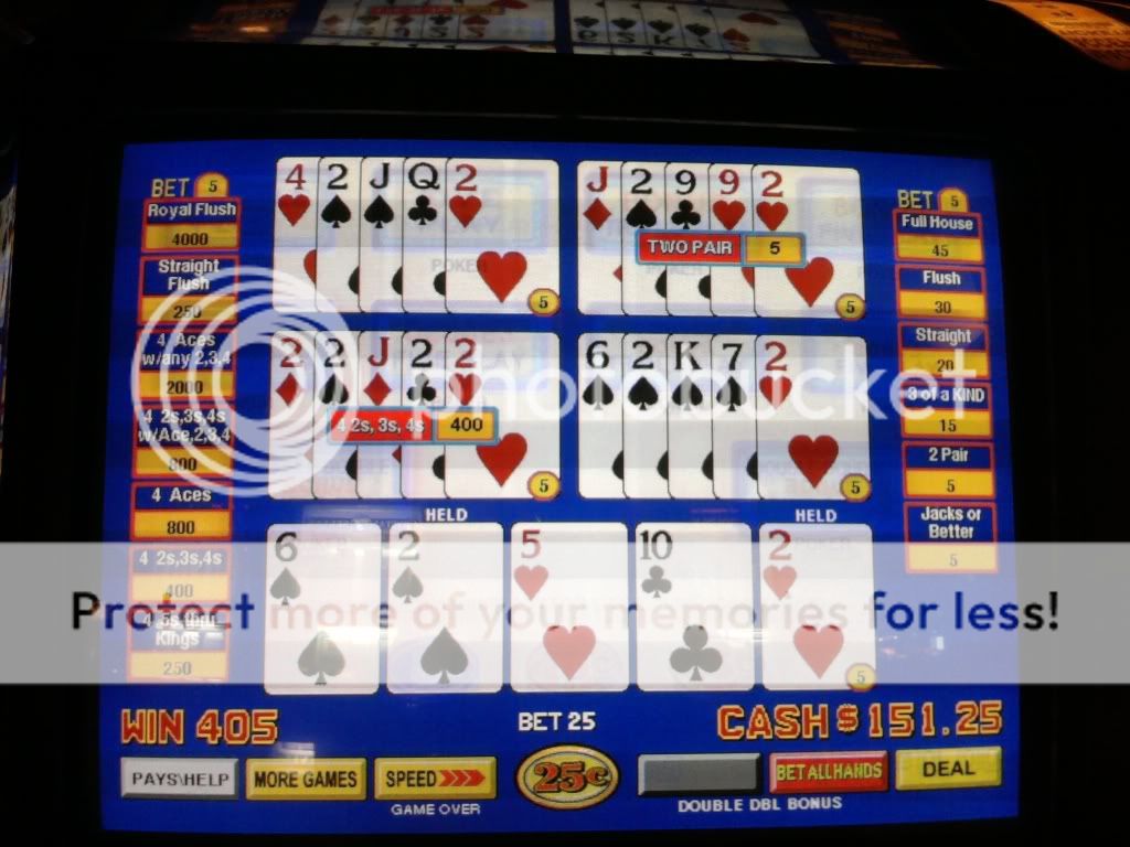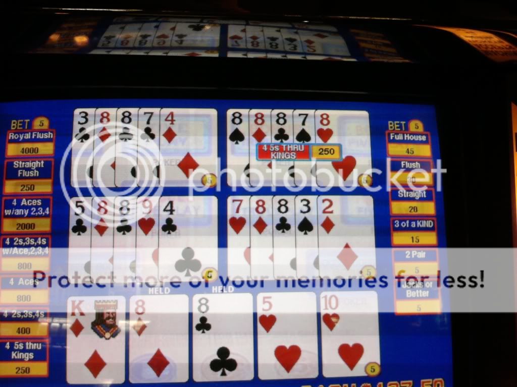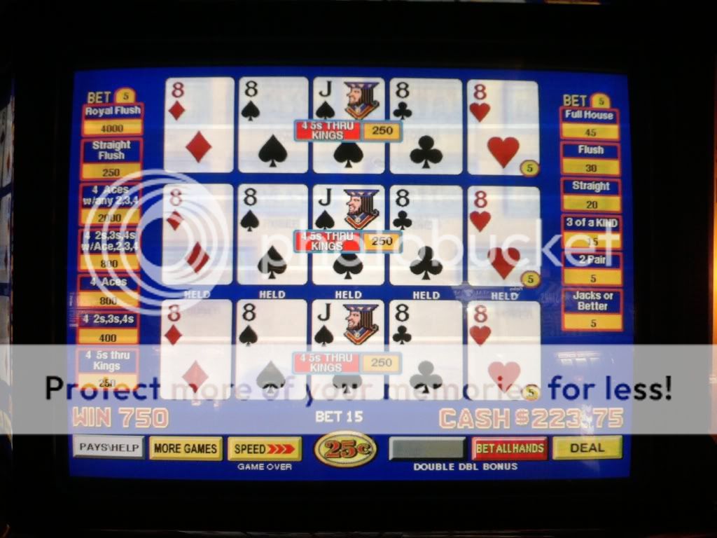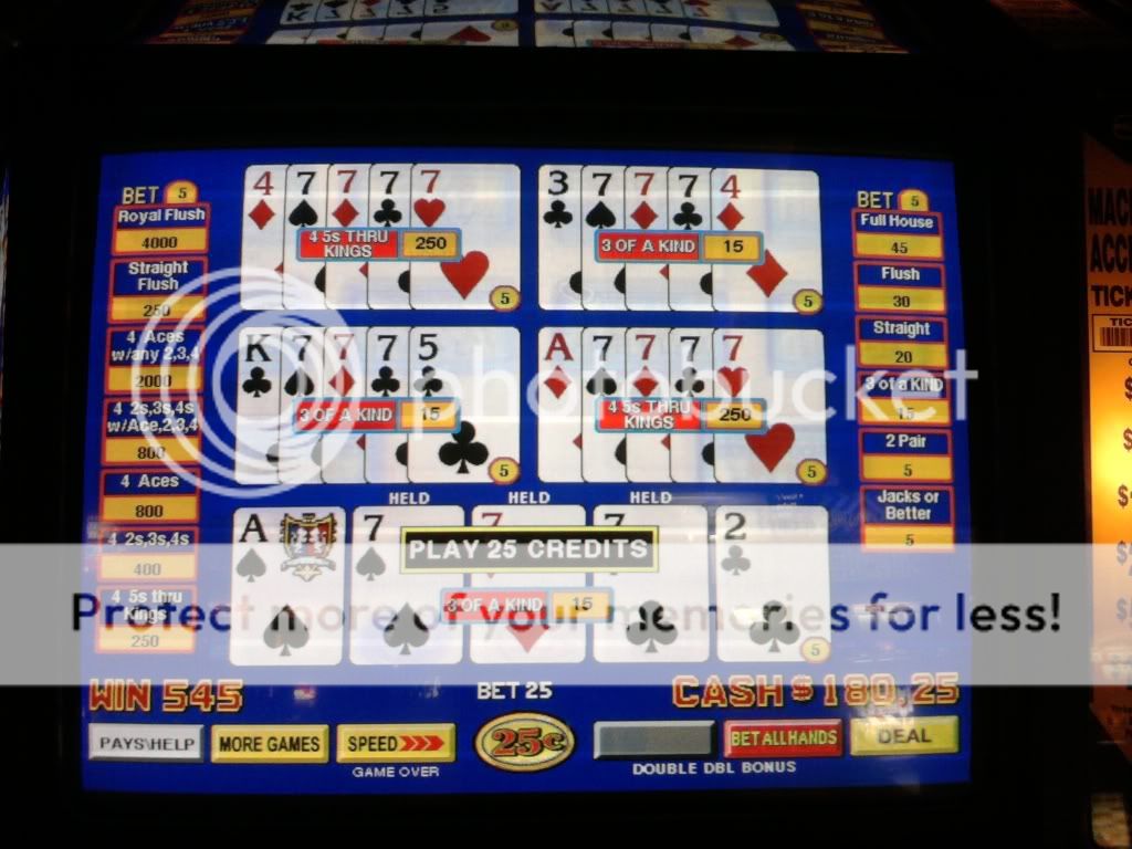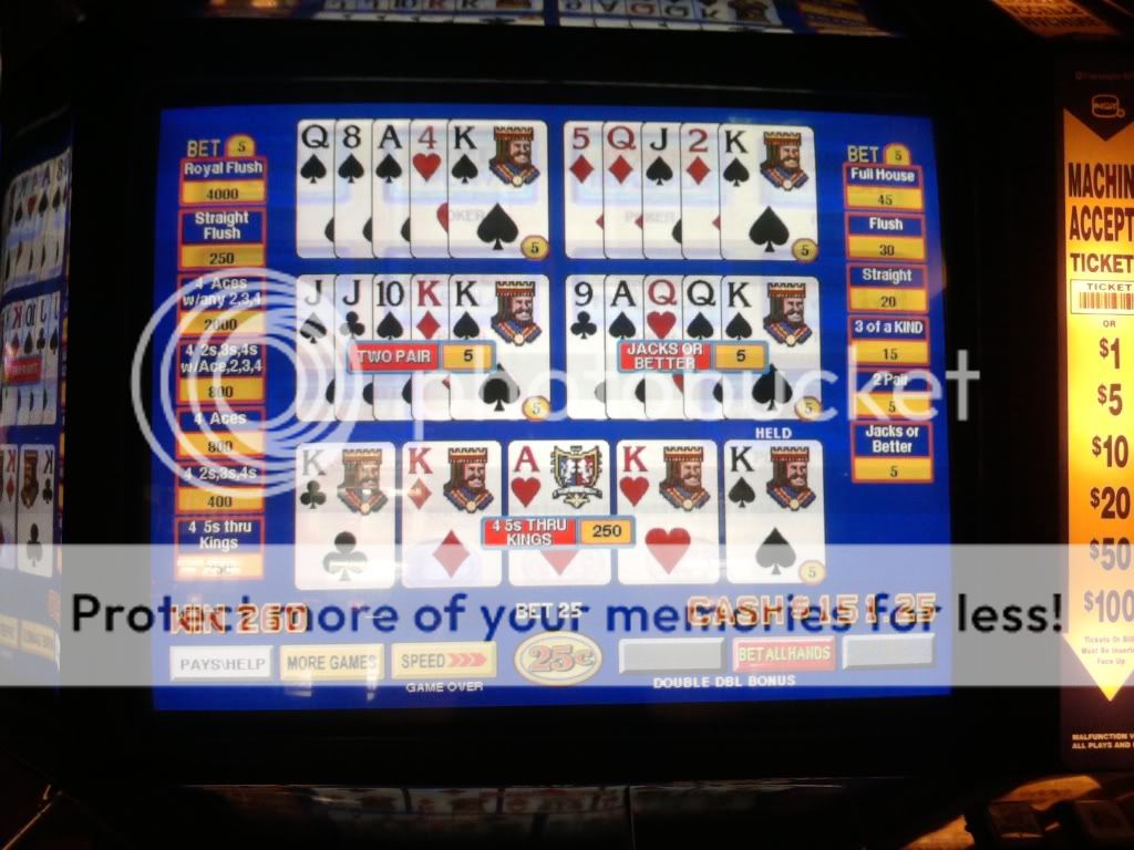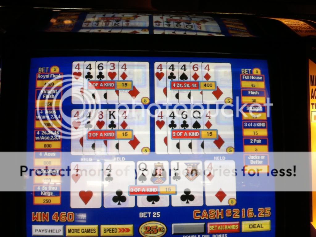 Just drew 3 kings to a single for a $100 on a Super Triple Play machine. I am enjoying the counter tickaway so I look to my left and see an older woman draw quad fours with a deuce. She holds the 4s and her hand moves to the draw button. I tell her that she shouldn't do that. That the hand pays $400 each because of the deuce. A woman on her other side backs me up on this. She tells me in a heavy eastern european accent that if she does this and loses money that I will have to pay it. I look at the other woman and she rolls her eyes. I told her to do whatever she wants. She had no clue even though I pointed to the paytable on the screen. Didn't have any idea how the game is played.
