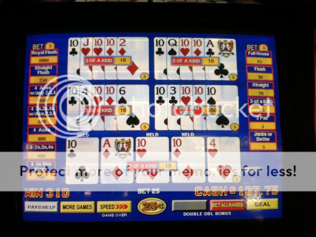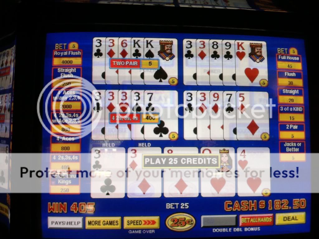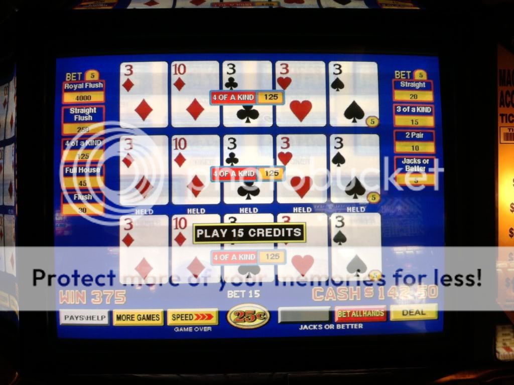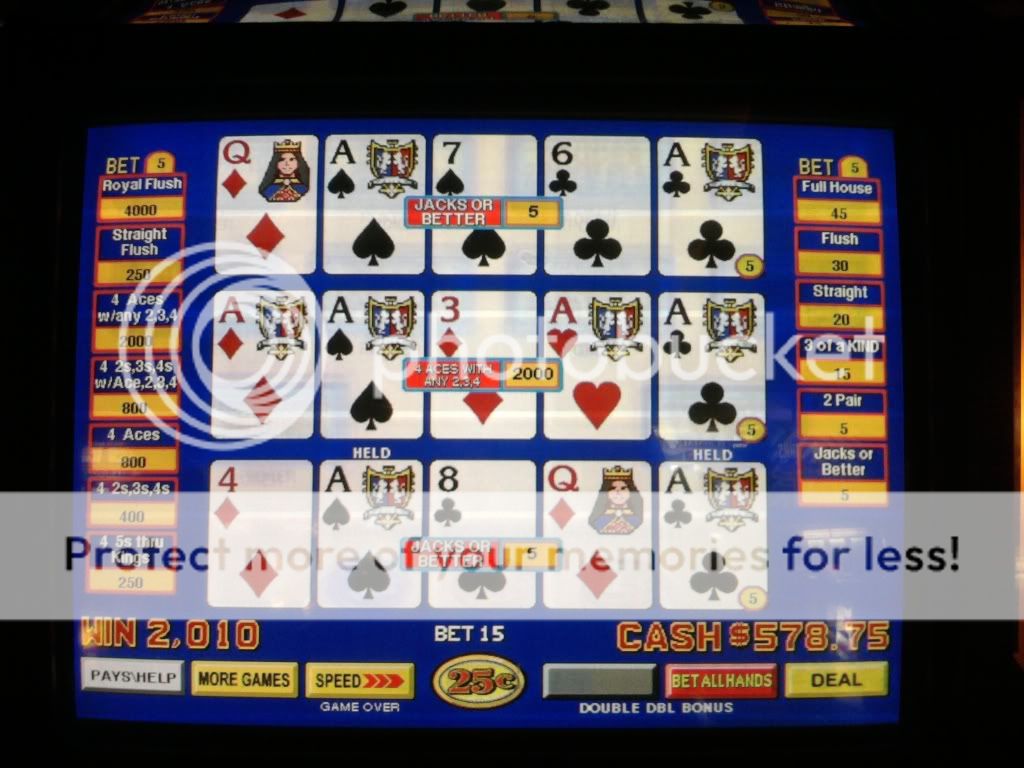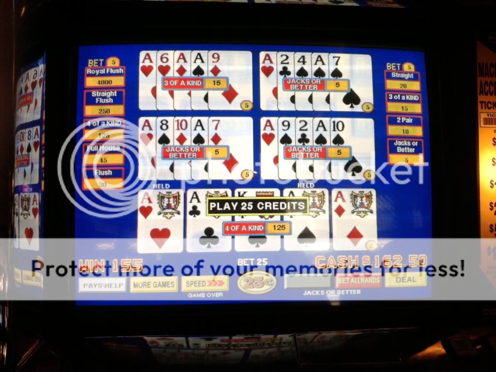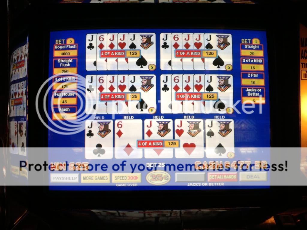 Just drew 3 kings to a single for a $100 on a Super Triple Play machine. I am enjoying the counter tickaway so I look to my left and see an older woman draw quad fours with a deuce. She holds the 4s and her hand moves to the draw button. I tell her that she shouldn't do that. That the hand pays $400 each because of the deuce. A woman on her other side backs me up on this. She tells me in a heavy eastern european accent that if she does this and loses money that I will have to pay it. I look at the other woman and she rolls her eyes. I told her to do whatever she wants. She had no clue even though I pointed to the paytable on the screen. Didn't have any idea how the game is played.