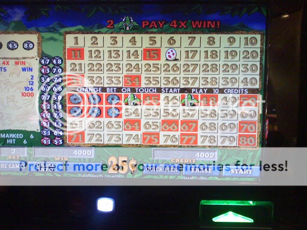 This was at the M-resort a few weeks back, as you can see, I was down to my last 2 coins left, when I hit this bad boy.., 6 out of 6 with two eggs cracked (4X multiplier) on Caveman Keno for $1000 bucks