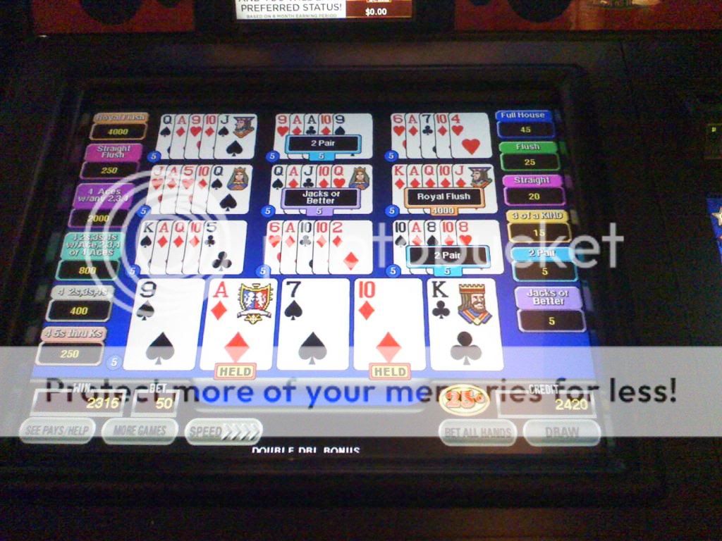 Woo Hoo we are back in the money!! I move over to a STP machine and decide to give it a whirl. The first time I ever played that machine about 2 years ago I had gotten Aces with a kicker for a $1500 pay out. So maybe the machine will like me again. I'm playing when I get the 5X multiplier and hold j, ace and king of hearts and get this.....