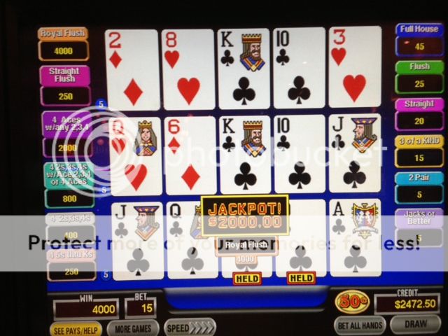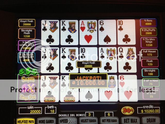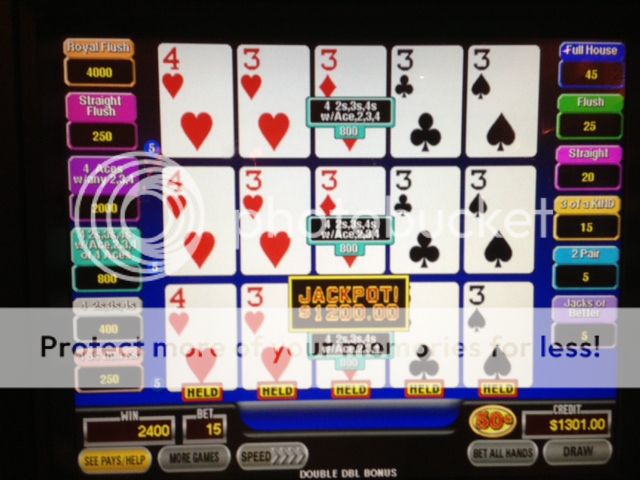 Last Sunday night 1/20 at joliet I was playing $1.00 triple play DDB, and got dealt 4 aces. When I dealt again, I got the kicker on one line for $3600. picture to follow by another Lva'r. Then tonight I was back there again (shame on me) and was playing .25 5 play supertimes and got dealt 4aces w/kicker for $2500.00. Unfortunately didn't get that picture because my phone fell in my kitchen sink thursday and it's acting up. By the time I got the camera to work, they were there and wouldn't let me take a picture. i don't understand that. It's my win. Oh well, at least I have the money.