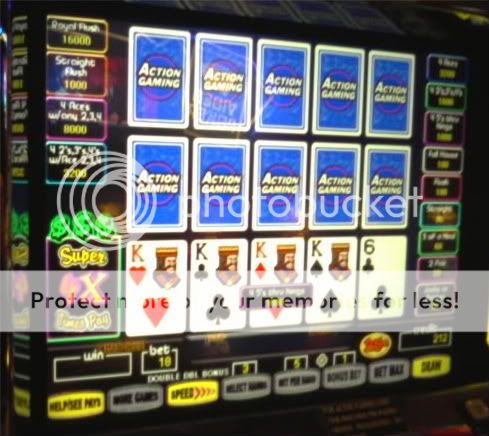 Later I hit this one short coin (third of the night actually - the second was with 2 coins in). This was playing the silly "Double Pay" poker which pays on the deal and the draw. Quarters is the lowest denomination available, and I didn't want to play 30 coins ($7.50) a spin, the smallest max bet possible on this game due to it only being available in 3, 5, and 10-play.