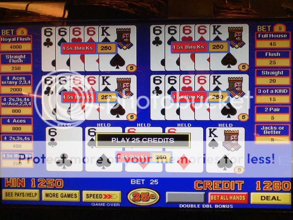 She ended up hitting 4 fives dealt on a 10-play $1 DDB poker machine, playing 1 coin at a time for $500 bucks in the H/L area, but the silly goose hit the deal draw button before she remembered to snap a pic of it first. Sorry about that.
