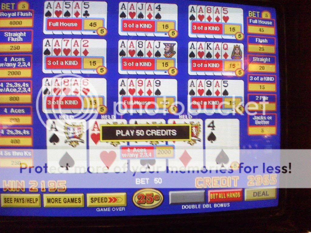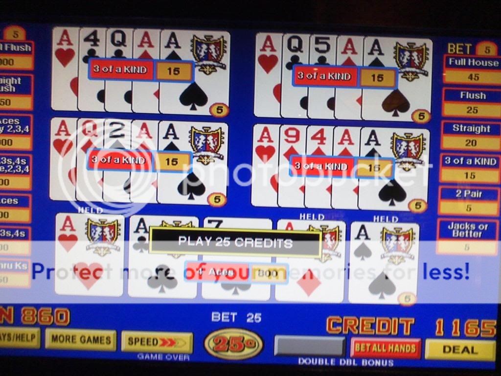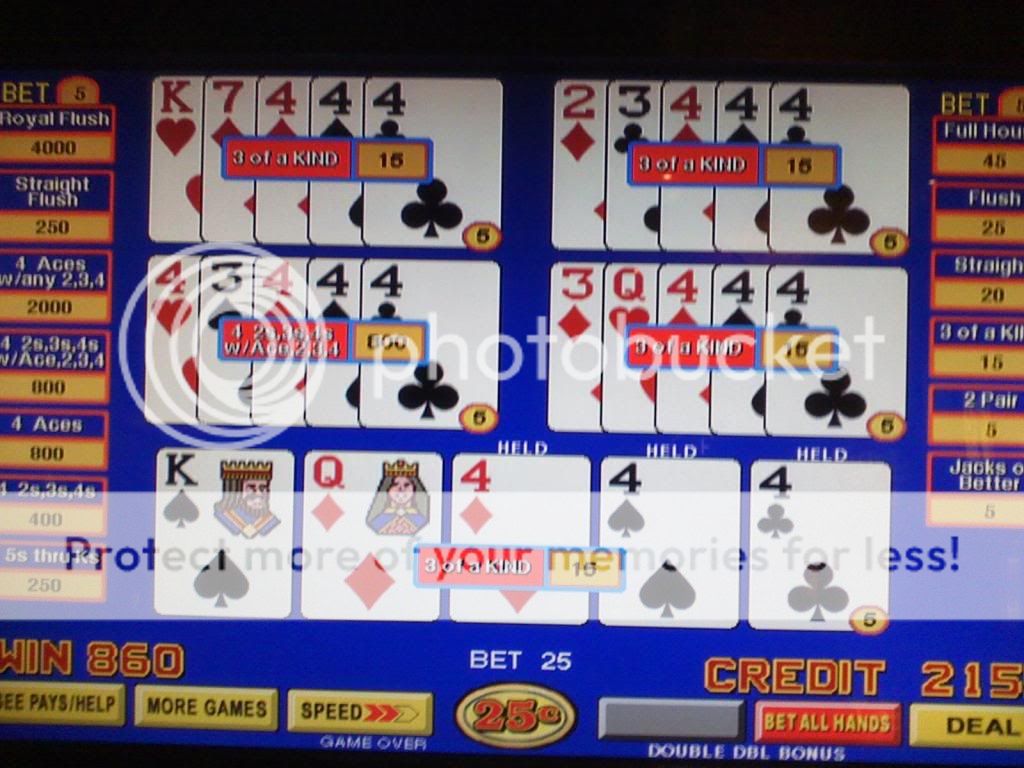 She ended up hitting 4 fives dealt on a 10-play $1 DDB poker machine, playing 1 coin at a time for $500 bucks in the H/L area, but the silly goose hit the deal draw button before she remembered to snap a pic of it first. Sorry about that.