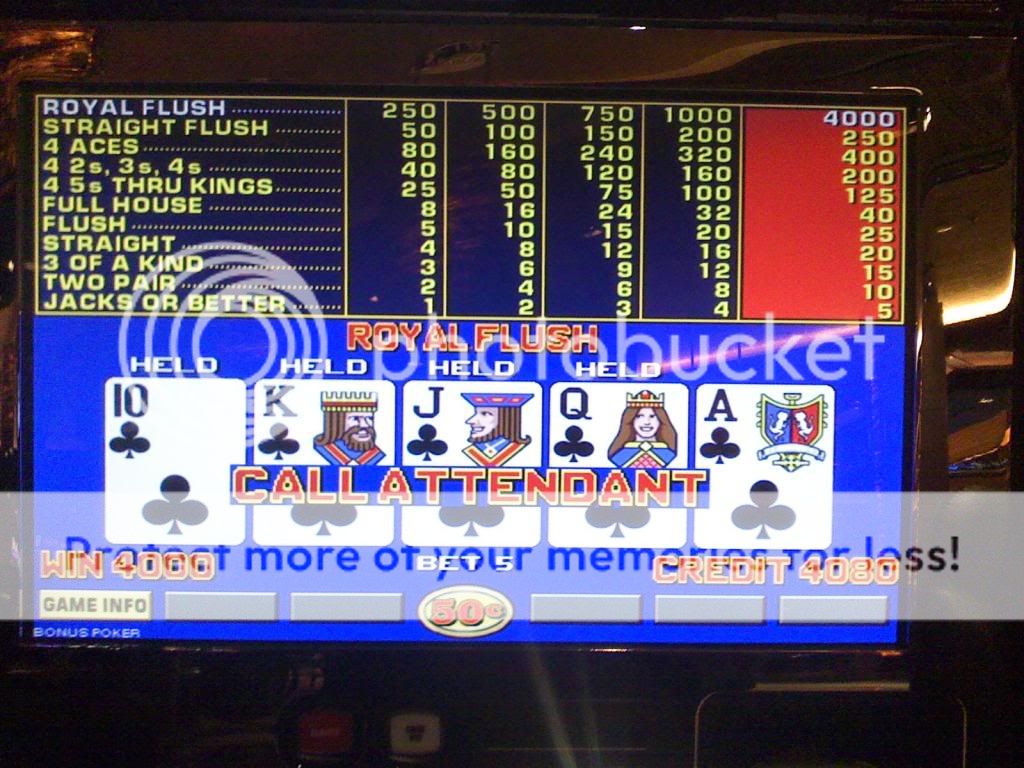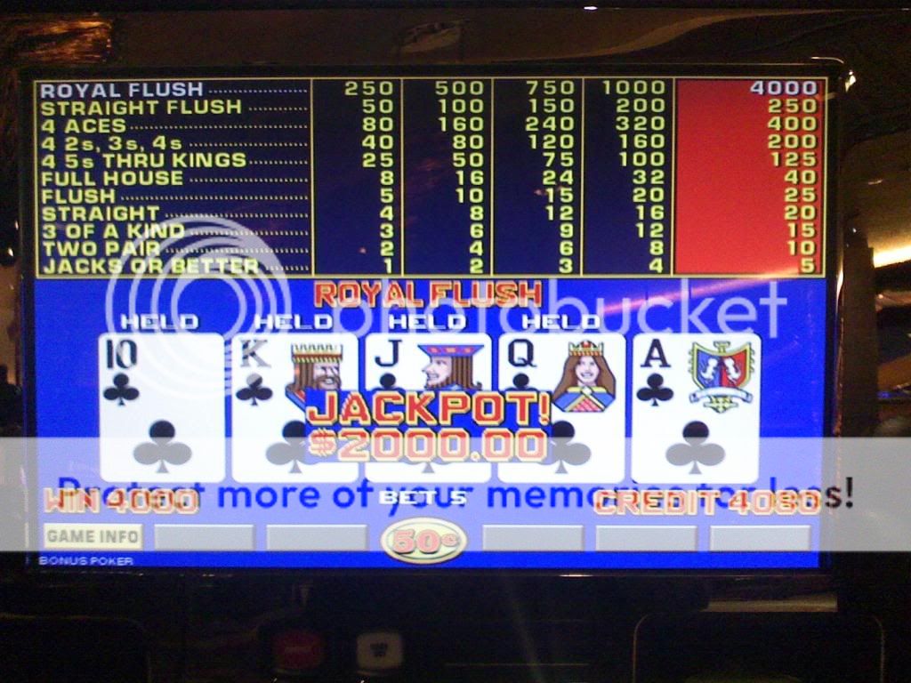 J-M, we play this stupid little game between us when we're playing side by side. We start with the $1 10 play. The person who goes first needs to win at least the amount of their bet to go again. If they're able to repeat three times, they go to the next level ($2). Again, if you tie or win your bet amoun three times, you go to $5, etc. We once got it up to $10 but quickly retrenched. I wasn't there to witness but Barb claims that it was her first attempt at $5 when she got this hand. However, from previous experience, she's been known to take a "liberal" stance on our little game. She instituted the "second chance bonus" which basically is a do over when you get a sucky hand. So, in the end, who knows? LOL More importantly, I'm not going to argue with her.