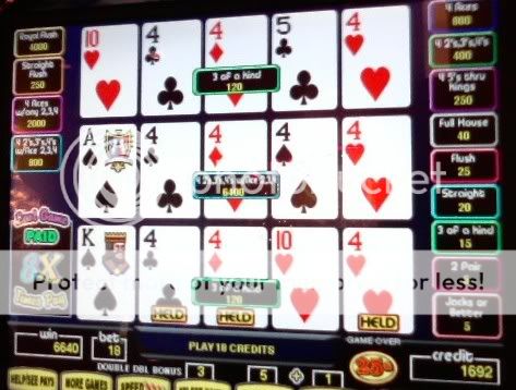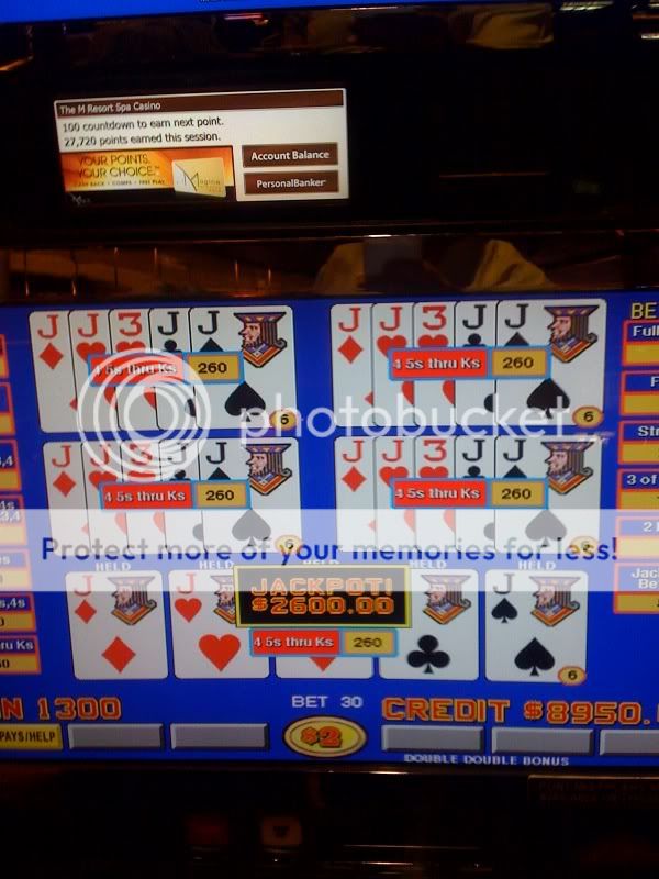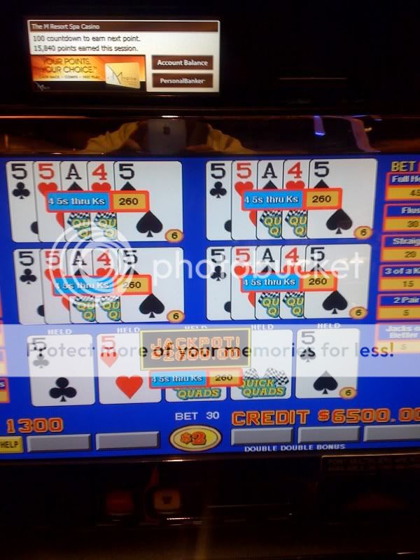 The icing on the cake was that we had $750 in FP and $435 in point play. We downloaded both at the machine and on the last hand, I connected for two Quick Quads for just over $1K.