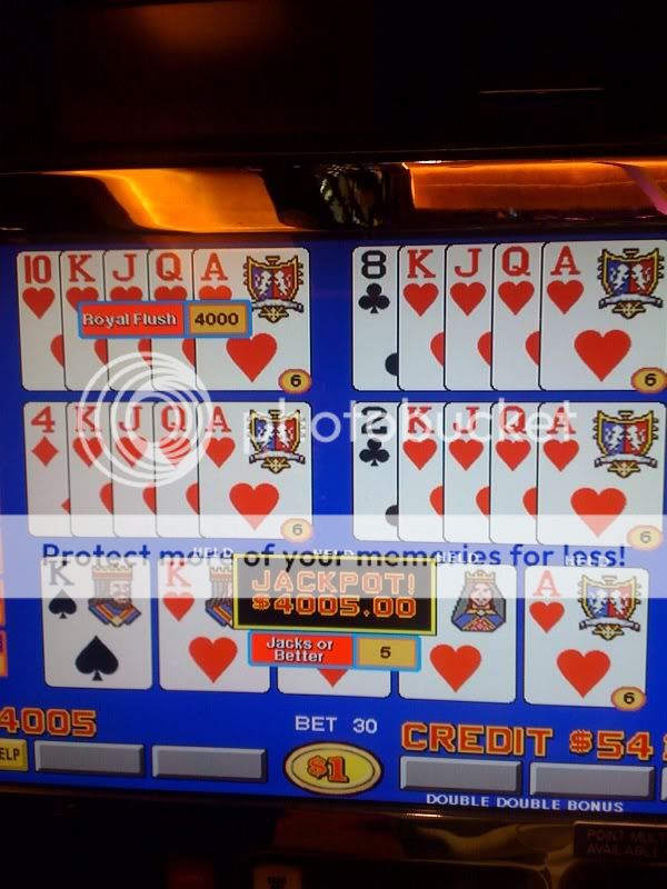 Before dinner, we were down $3K. After dinner, Barb went to change shoes and get me a cigar from the room and I loaded the machine with $1K and began playing on her card. Within the first 5 minutes I was dealt 4 hearts to a RF. Seeing that it was her card in machine, I opted to wait for her to appear and push the button in the event we got a RF. I had a silly situation at South Point just over a week ago when I was accused by a floor person of pushing the button on Barb's machine on a handpay and they wanted to issue me the tax slip. So, leery of this, I opted to wait. She sat down, pressed the button and out popped this: