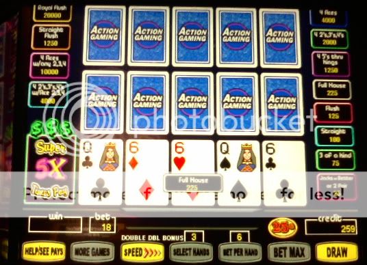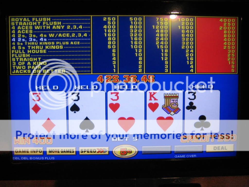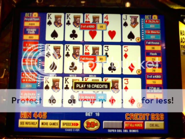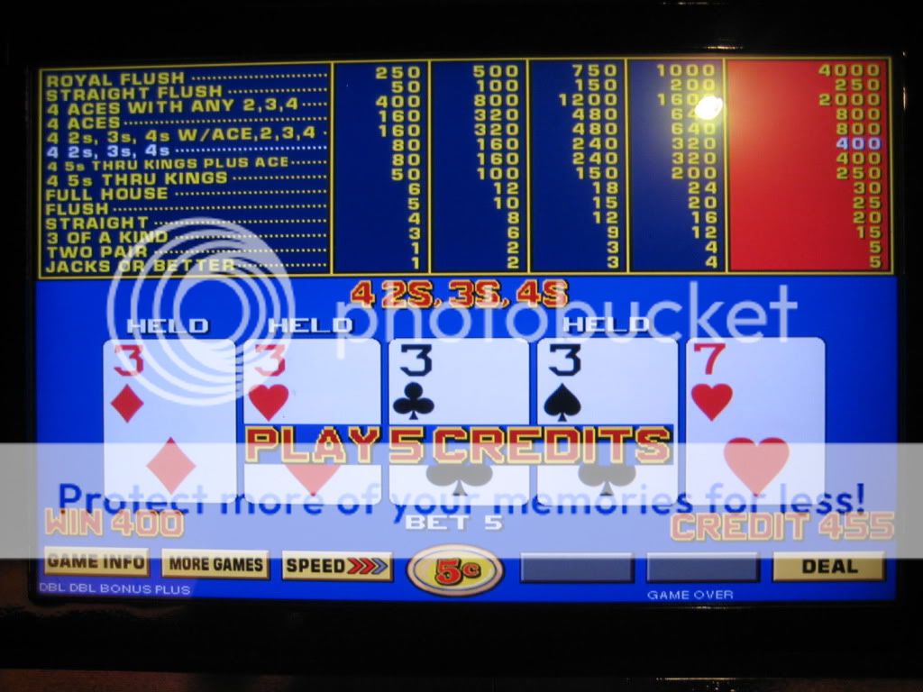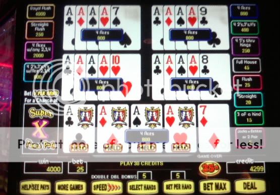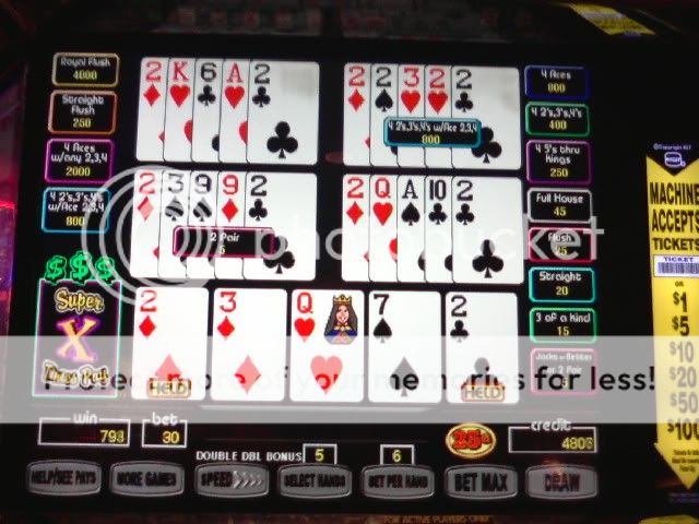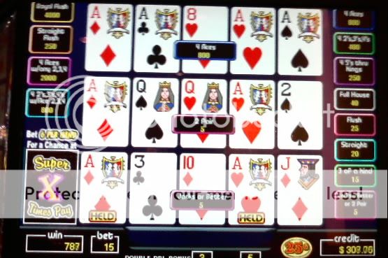 I played $100 through the 25c DDB when I first got there. Couldn't get squat. Went to the 5c only machines and got a total of 9 4OAK or better including the royal. The last hour I went back to the 25c machines again ..same result....no 4OAKs. For some reason my luck lately has just been phenomenal on the 5c machines so I'm hitting them pretty hard for now. I have never before had these results playing any denomination. I'll loose money on the 25c machines and make it back plus some on the smaller denomination, worse paytable machines. I don't understand it but I am sure enjoying it while it lasts.