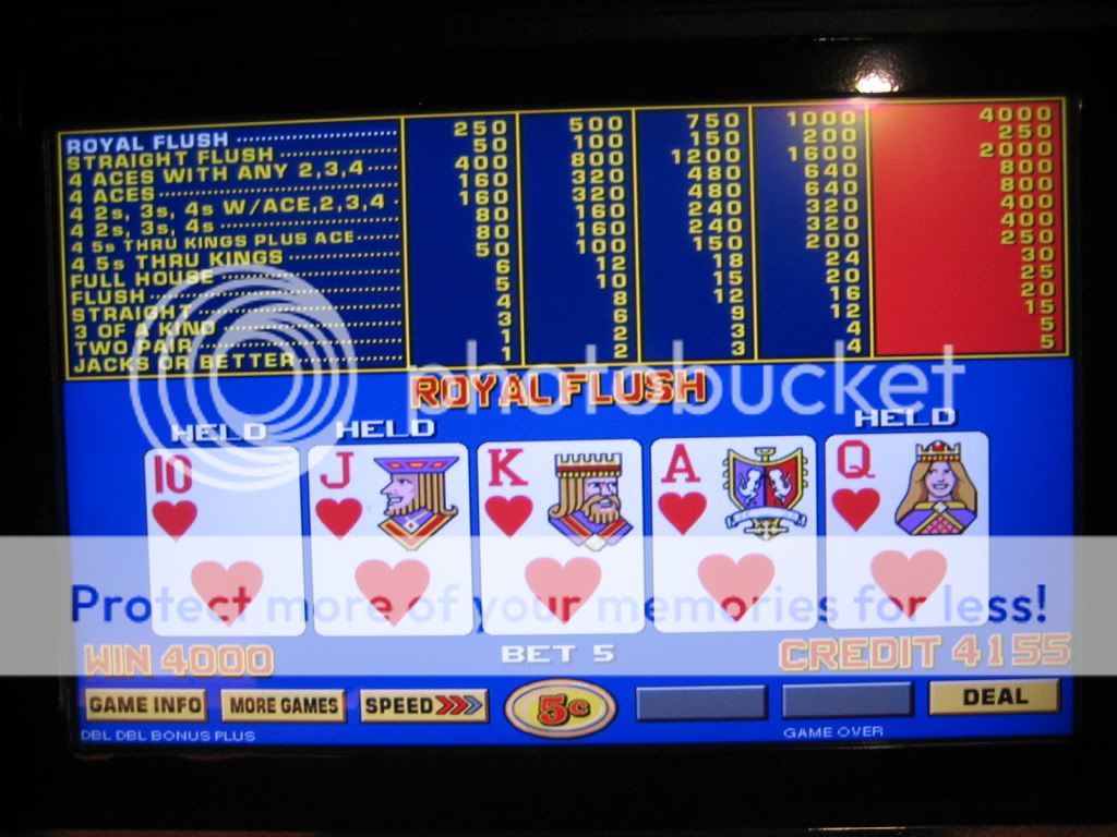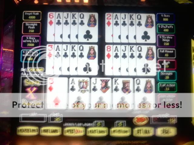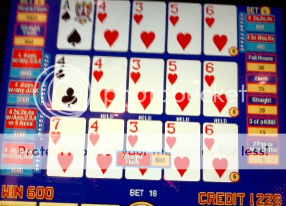 I draw 5 diamonds....not even a bleepin' pair. Some may notice that I did not play the extra 3 or 5 coins on an STP machine. Sometimes I do better that way.