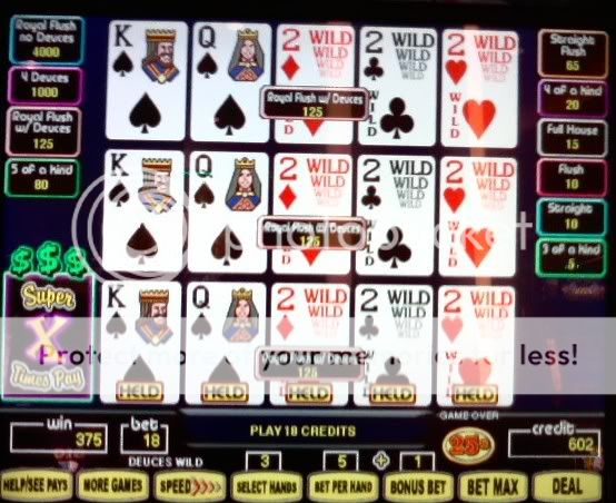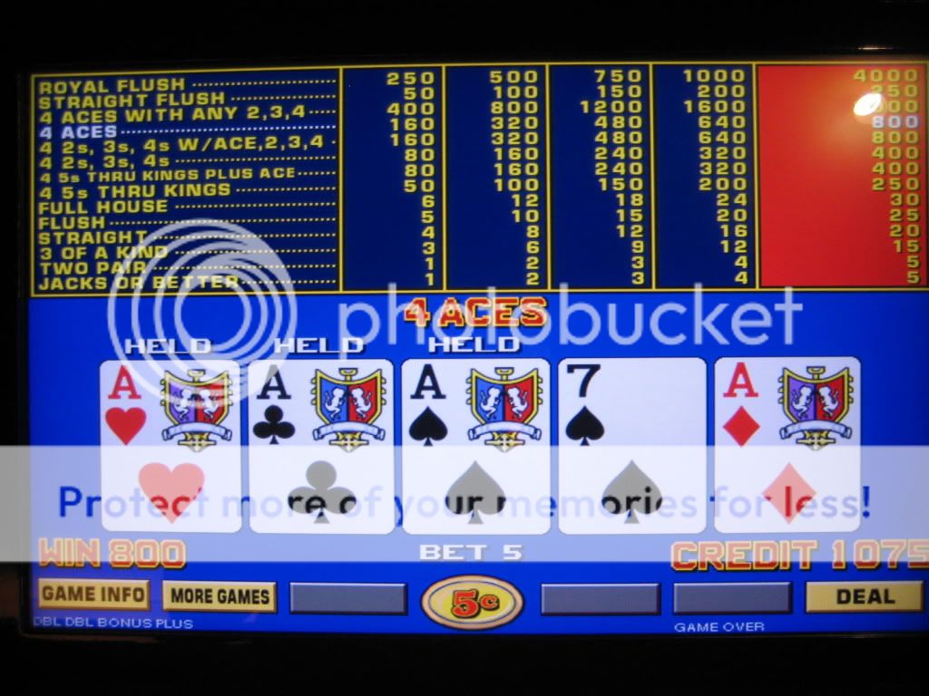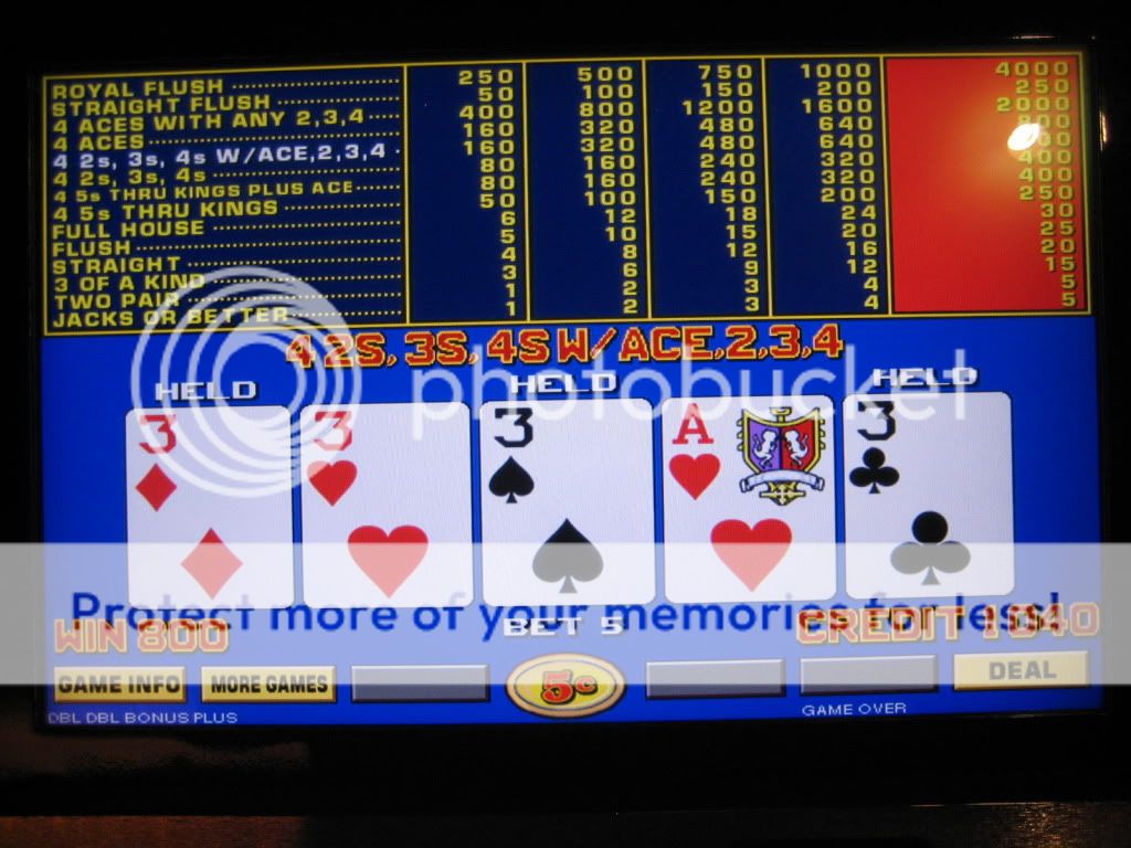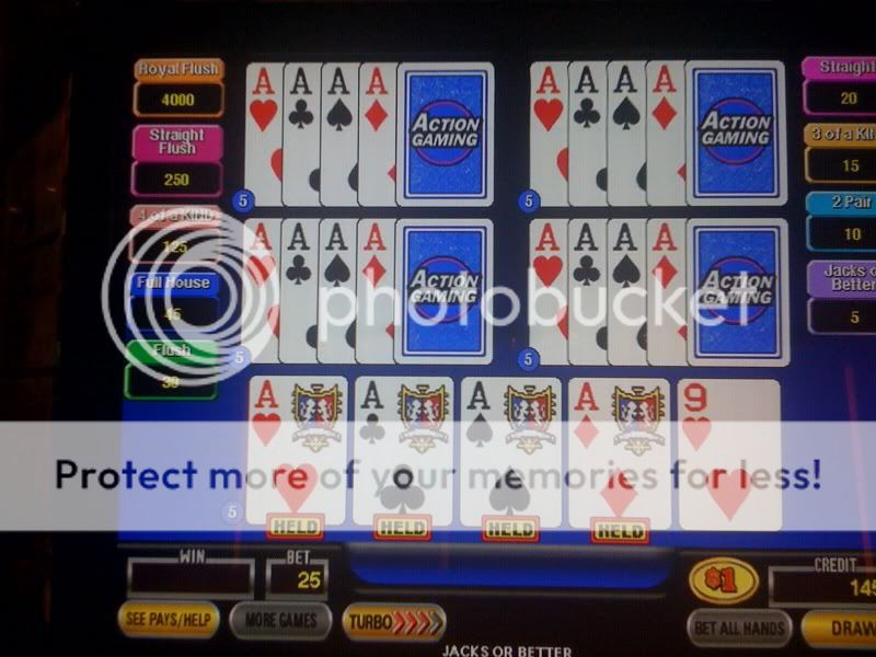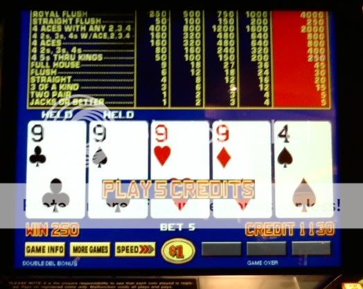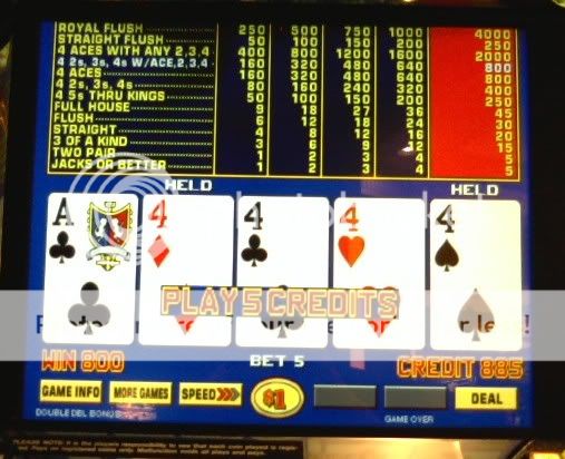 I play about a dozen hands and draw 2-4s and an ace to pair of 4s for $800. Take this photo and am dealt pair of 9s and draw 2 more for back to back quads.