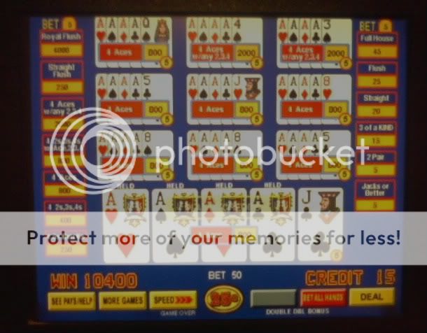 After making some money at craps I take my last $100 I will put at risk and play at an 8 machine kiosk of $1 9/6DDB. As I walk up I see a man with 4aces/king after the draw on the screen. He is dealt 3-10s and catches the 4th. I comment that he should've been playing Shock Wave.