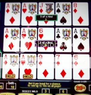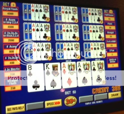 I am playing Triple Double Bonus when I draw to 3 aces. I had drawn to more than a dozen sets without a single quad. So I figure that I was due....ya right !