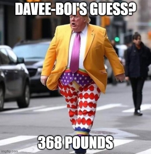 When he gets booked at the Fulton County Jail, he will be weighed. So gang, how much do you think he really weighs? Last time I checked, his White House sleazoid doctor claimed 239 pounds.
