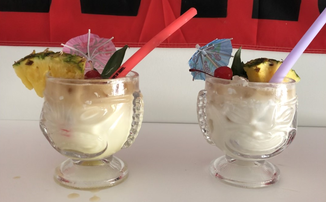 Reminds me of my favorite they served at Trader Vic's in St. Louis, the Kamaina. Coco Lopez, Cointreau, gin, 7-Up, something else, marachino cherry and pineapple for garnish. Served in a ceramic cocoanut mug. You got to keep the mug and I had a collection of them, still have a couple,