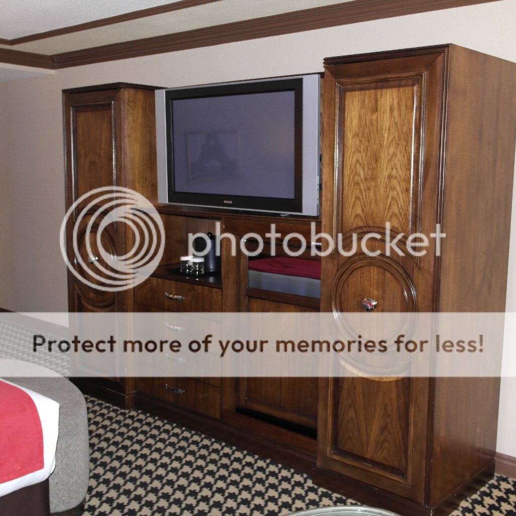 The TV, closet, and drawers all within the one unit—getting a little dated