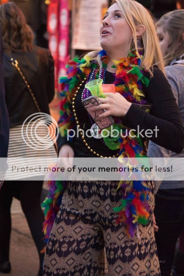 Waiting for someone to throw her some beads. Above, they’re waiting for her to earn them.