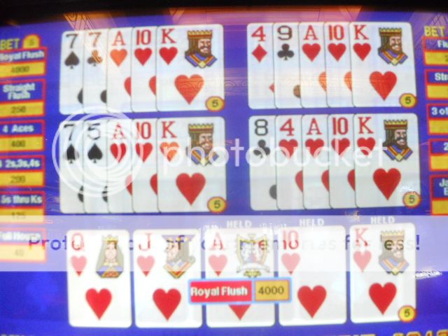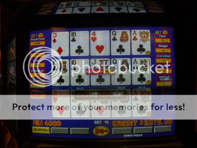 The last 2500 wasn’t close to being nice to me as the first. Not only did I not get any royals, but I didn’t get and quad Aces (I was dealt three Aces on five or six occasions and just couldn’t snag the fourth one). So, needless to say, I did drop some of my profits from the earlier session, but nothing too serious. Bottom line is that I ran 50K through the machines and I had my bonus. The tool box gets a nice infusion of cash for my trip to Las Vegas next week. Also to be considered is the 5X points on the 50K, which means an extra $250 in reward comps.