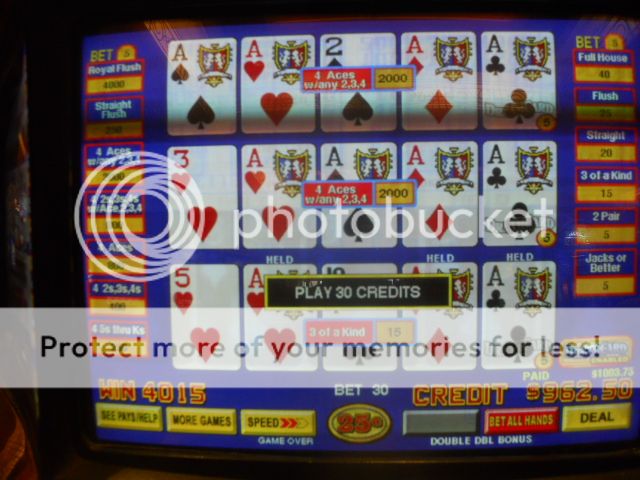 On this machine, there’s no hand play. The machine automatically ticketed out the amount (because I still had $800 on the machine and it won’t you to accrue more than $1200 at a time). I worked that up to $1100 and continued to play. But since I was way ahead, I thought I’d take a shot with a couple hundred playing the Dream Card Bonus. I switched to Double, Double Bonus triple-play. After a few hands, I was dealt two Aces, the dream card gave me a third and the top two lines gave me another Ace with the kicker, good for another $1000.