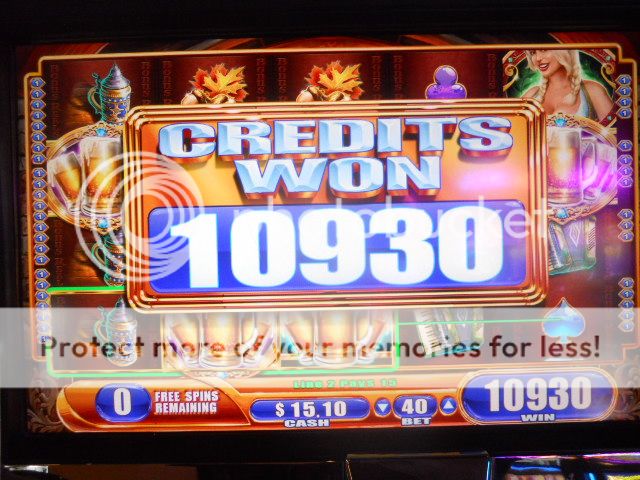 After the tournament session, I went over to the Quad and signed up for one of their daily $30 poker tournaments. I suppose I’m just a glutton for punishment because I’ve now played in about seven or eight of these and have yet to come in the money. However, it’s cheap enough to keep trying and I always seem to have a good time regardless. This session only had 22 participants and I came finally lost in 7th place—once again out of the money. I’ll keep trying. Just when I thought it might just not be my day, I was heading toward the valet when another Bier Haus machine caught my eye. I slipped in a $20 and played the minimum. I soon had a bonus round of 53 spins. Not only did I hit a couple big payouts, when my spins were up, I also received the minor progressive for an extra $45. Sweet!