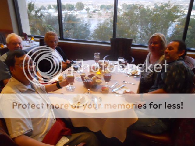Our reservation at the Range Steakhouse was at 5:30. Recently, Harrahs’ properties have been closing their steakhouses and contracting out to Ruth Chris and other national brands. However, Laughlin is holding out and it’s easy to see why. After finishing our salads, the place was already full. I have dinner at my mother’s house every Monday night that I’m in town (started 25 years ago when I was still finishing my college degree we called Starving Student Night), so I was really glad to treat my family to some fine dining. With all this play, I continue to build reward points and I’m always trying to do most of my playing on multiple point days. Because Caesars comps me more rooms and food I need, I find that it’s almost hard to spend the points. It’s nice to be in a position to do this. The six of us had a range of dishes: I had the special of the night, steak stallions and spicy shrimp; Martin the lamp chops; Rick had the chicken and pasta; Pam the shrimp fettuccini; Pop had prime rib; and my mom—the lobster. All the meals were great and the service excellent.