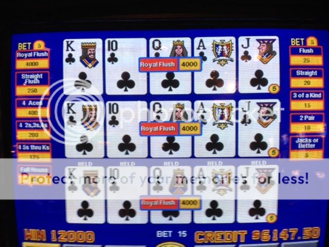 First, let me tell those who have inquired that all the VP machines at the bar still have 8/5 Bonus in all denominations. And there’s more good news: the machines that were taken out against the VP area wall that had 8/5 Bonus have been brought back but are now across the way against a wall where the old sports bar used to be. Fortunately, my Dream Machines are still there (I have no doubt they will be gone sometime in the future, but hopefully not for a very long time). I played until 11:30 and just about 1000 tier points, but I was down $500. I knew I was due for a losing day as the past couple of trips have been good for me with a couple of royals.