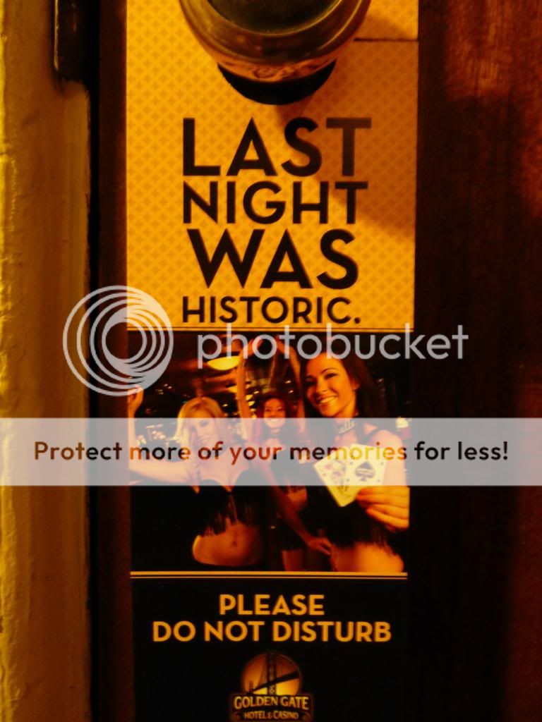Finally, at midnight we boarded the plane, taxied, and then had to have the plane de-iced..groan. Spirit had selected my seat,,row 22, window..no complaints. There was a young child..around ten years old sitting in the row directly behind me....he could have been the poster child for the CDC. He coughed and hacked all flight long...expectorating his potentially lethal germs in my direction. Once we got above the storm in Minneapolis the flight was rather uneventful. We landed in Vegas around 01:30 and I made a beeline for the airport shuttles. There was only one shuttle bus, and it looked like they were not going anywhere soon...screw it..take a cab. I told the cabbie to take me to the Golden Gate; I also told him to not even to think about taking the tunnel or the interstate. "Swenson to Paradise..and you know the rest of the way, dude." He turns and says, "So, you've been to Vegas before?" Damn straight.