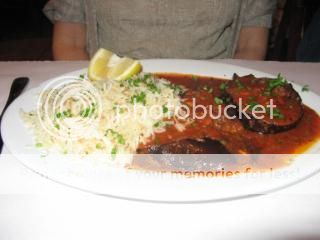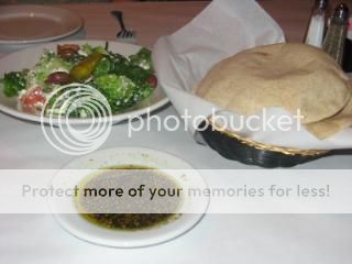 Dinner this evening was at Khoury’s Mediterranean restaurant. This is another small, family-owned restaurant. I had a gift certificate good for 2 glasses of merlot and 2 entrees. We also shared a Greek salad and a complimentary pita with olive oil and balsamic vinegar.