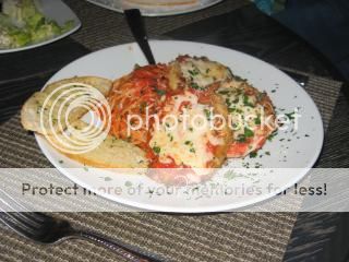My lowly expectations for this meal were realized. The restaurant was not busy, but everything from start to finish seemed to take a little too long. We were served warm garlic bread with balsamic vinegar and olive oil, but the bread was too salty. We also shared a below average Caesar salad. The lobster ravioli in a tomato cream sauce ordered by Ann was a bit too al dente while my eggplant Parmesan entrée was heavily breaded thick slices of undercooked eggplant.