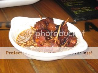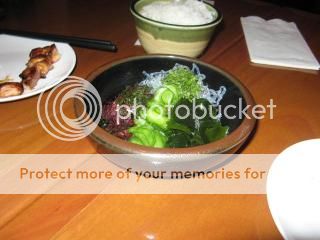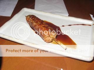 This is a small, contemporary designed restaurant with the same ownership as the Naked Fish. We started off with the day’s sunomono (vinegared vegetables including seaweed, 3 Forks), shoniku (chicken skewer, 3 Forks), tsukune (ground chicken and pork skewer, 3.5 Forks) and rice.