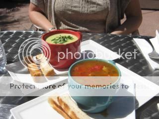 After I finished counting my money, we headed for the difficult to locate, but worth the effort, Baguette Café. This restaurant is in a large office park and only open Monday – Friday for breakfast and lunch. The weather was close to picture perfect so after ordering cups of their housemade soup, we settled in at a table on the patio.