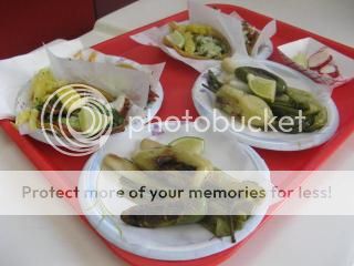 We split 4 adobada (spicy pork) tacos topped with crema, cilantro, pineapple and onion plus complimentary side orders of grilled peppers and scallions plus a soda.