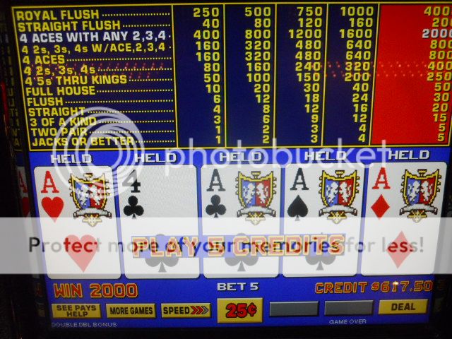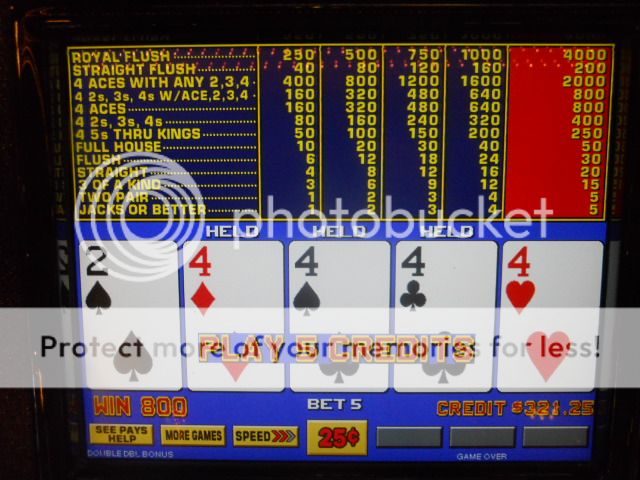 I had enough of the penny games and played some 7/5 BP Quick Quads. Played a long time, but just couldn't get any traction there and was down $50 and was going to call it a night but I noticed that the 9/7 DB progressive was over $1800 and just had to give it a shot. I only caught a couple of full houses, so when I reached my original $100 I quit. It was a losing day, but all things considered not as bad as it could have been.