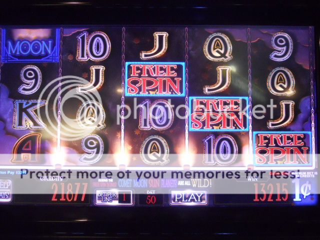 Thought I'd take that hundred and play some of the penny games (15X points pretty nice). Twenty at a time playing minimum bet. Double it, hit a bonus, or lose it would be the plan. Played Stoneridge and hit the bonus on the second hand (about $13); then Hercules, hit bonus when down to $3 and won $21; then Beer Haus and hit a bonus early but only won $12; and then the Mulitmedia machine called Star Nights. I hit a monster on this at the Westgate a couple of years ago. My twenty was down when I finally got the Free Games. It then retriggered four times—a total of 28 spins. On the second spin, three wild images (sun/moon/comet) came up and that gave me a $122 win with all these spins to go! Well, it figures the rest of spins didn't do much, but I cashed out a very nice $133 win on the $.50 bet.