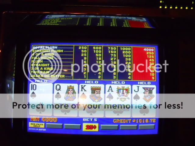 I went back to Harrahs and decided to play one last hundred through the 9/6 Jacks. I was down to $17 when I was dealt four to the royal in spades. I thought to myself, "How coincidental, I need the exact same card Terry (dorianmac) needed when we were at Barona a couple of weeks ago, which he filled--the Queen of Spades. I hit the deal button and up it pops!