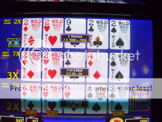 I sat down to play some 9/6 JoB, and simply went into a quad drought only hitting one set the entire session and was down $100. I then found a nickel Ultimate X VP. You have to pay double for an accelerating multiplier. Ugly deuces was the best schedule available and I put in a hundred. Things started out great catching quad deuces on the top line (triple play) on the second hand (no multiplier, unfortunately). But then it went cold. This game is like crack to me. I love it, but it can kill you in no time.