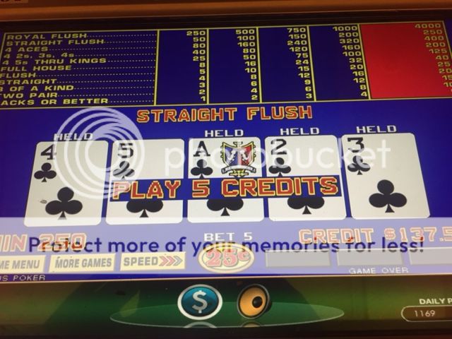 I headed back to Sam's and it was too early for bed so I played a BG there and caught a great line hit (Buffalo 2X 2X 2X) for a $147 profit (this was after I dropped $50 on a Game of Thrones). The 8/5 BP progressive was up to $1300, so I played it and after a few minutes was dealt a straight flush. I soon cashed out with another $50 profit and went to bed.