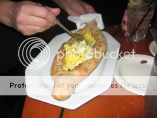 For those who have not been to Bulgaria or Russia recently, Adjarski Khachapurri is a boat shaped loaf of bread served directly from the oven with cheese and a cracked egg that are cooked and mixed together tableside.