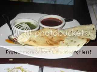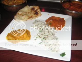 We received complimentary papadum with a spicy mint sauce and the worst tamarind sauce I have ever tasted. Our entrees were boti kabob masala (lamb chunks in a rich yellow curry) and Murgh madras (boneless chicken in a tomato/cream curry). In addition, we ordered naan and zeera rice (lightly spiced basmati rice with cumin seeds). Neither entrée scaled any culinary heights though the amount of animal protein in each would likely have caused Hannibal Lechter to rejoice. ($20.70, R.com, 2 Forks)
