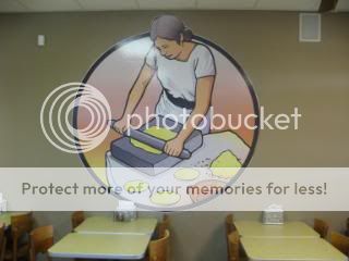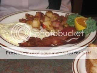 My first buffet breakfast of the trip included OJ, fresh fruit with strawberry yogurt, easy over eggs, a sliver of ham, bacon, a bloody Mary and a Tums. ($4, 2 Forks)