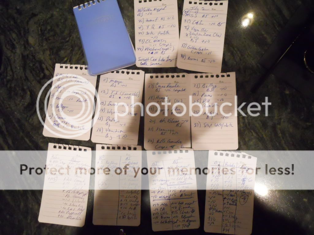 Today started off with listening to someone working on a room down the hall with a drill. Strange but then sleeping in late is not my usual thing either. I headed out of Harrahs in search for a Starbucks to turn in the yesterday’s journal. As much as I enjoy doing these journals every day, and as important it is for me to write, it does eat up a couple hours each day. That’s not a complaint, it simply is what it takes, and I have to plan my schedule with that in mind. I mention this because a couple of members have asked how I keep everything in order and remember it all. I take a little pocket spiral notebook with me and make a note at each place and how the bet turned out and any other small information that I might want to remember when I write the report. However, as most of you that contribute to this blog write your trip report at the end of it, my trips are SO long that I’d forget many of the smaller details and my thought process at the time, so I write them each day. I’ve taken some of my notes out took a picture of them.